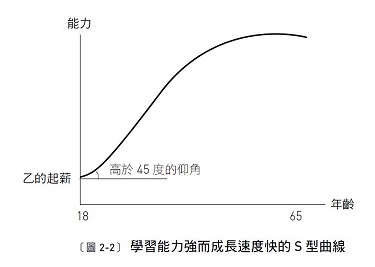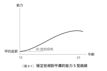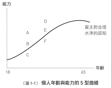 首先,讓我們再次檢視(圖1-1)個人年齡與能力的S型曲線,圖中的S型曲線是雇主對於「合理水準」的認知,也就是一般平均而言,在職場上所觀察到的水準,然而,每個人的差異很大。