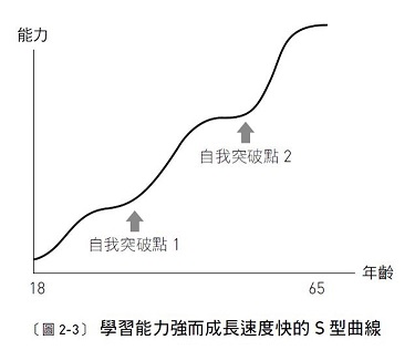 丙:不斷自我突破的卓越者,他們的能力曲線如〔圖2-3〕,很顯然地,他們在一生中會有好幾次的自我突破經驗,根據我對這些人的觀察,他們除了普遍也都具有前面乙類型(學習能力強而成長速度快的人)大量與人溝通、大量閱讀、以及自主性學習的習慣之外,他們還多了兩項共同特徵:追求卓越的習慣、願意接受新挑戰的習慣。
