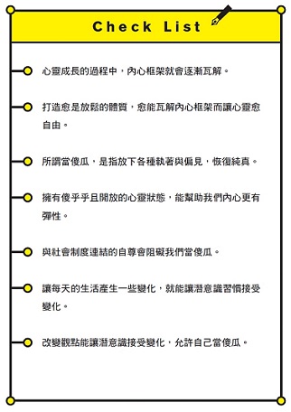 當然,不是真的要你頭殼壞掉。「當傻瓜」是指放下各種執著與偏見,回到最純真的自己。不逞強,以最自然的狀態自在地表現自己。若能隨時如此自得,就具備能應付各種狀況的放鬆感了。