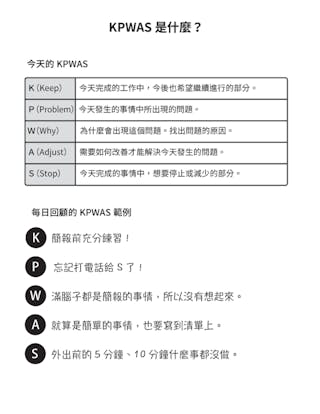 附帶一提,這個「KPWAS」源自於顧問天野勝先生所提出的「KPT」方法,我起初也是依照該方法來填寫。