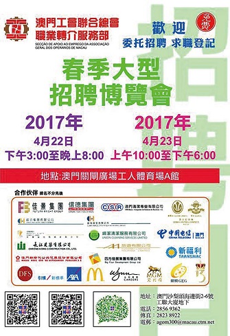 由工會聯合總會職業轉介服務部主辦的「春季招聘博覽會」,將於本周六及周日在關閘工人體育館A館舉行。是次博覽會將有18家企業參與,提供司機、工程、服務、餐飲、保安、文職等逾1,000個全職或兼職職位空缺。工聯表示,現場設有即場面試,提醒求職者把握機會,做好充分準備,找到合適工作。