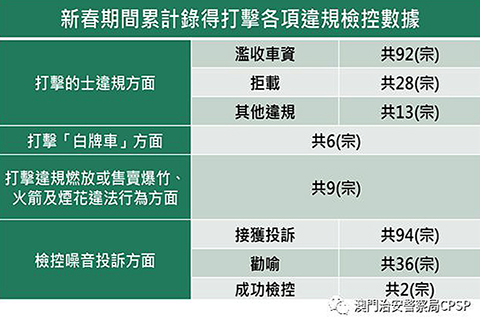 農曆新年期間,治安警察局持續打擊各種違規行為,當中包括對的士違規、濫收車資,違規燃放或售賣爆竹等作出監察和檢控。