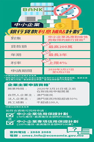 而為增強中小企業的資金流動性,特區政府推出臨時性的「中小企業銀行貸款利息補貼計劃」,透過提供上限為四厘,貸款上限為200萬澳門元,補貼期最長為三年的利息補貼,讓中小企業取得銀行的抗疫貸款時減免利息負擔。利息補貼計劃自3月17日推出至8月15日,已接收4,598宗申請,批准4,069宗(約八成九),獲補貼的銀行貸款金額約52.1億澳門元,涉及的利息補貼約為3.2億澳門元。