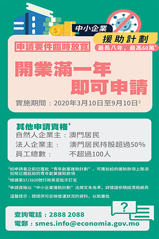 「中小企業援助計劃」臨時放寬申請條件的實施期將於9月10日結束;而「中小企業銀行貸款利息補貼計劃」的申請期亦將於9月17日結束。有需要的中小企業,可透過經濟局網頁( www.economia.gov.mo )了解計劃細節並及早提出申請。
