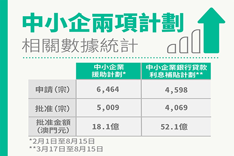 自2月1日至8月15日,「中小企業援助計劃」以及「中小企業銀行貸款利息補貼計劃」合共接收逾11,000宗申請,當中超過八成個案已獲批,為澳門中小企業注入超過70億元的流動資金(包括18.1億的政府貸款及52.1億的銀行貸款)。