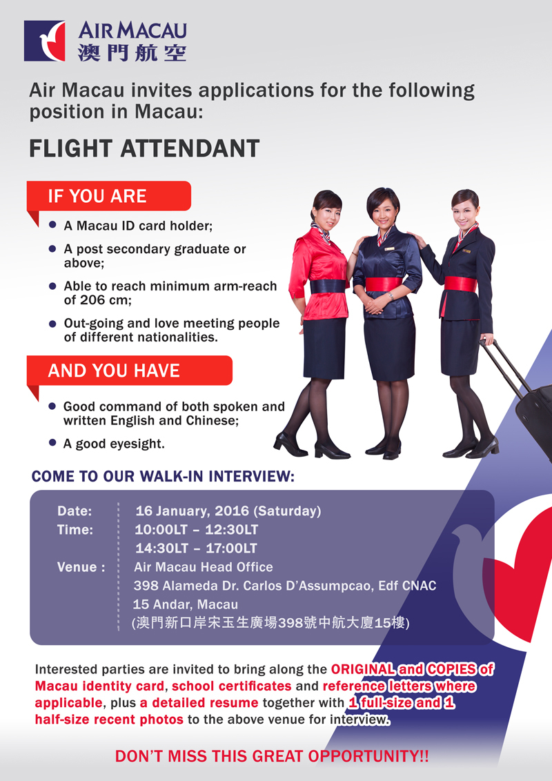 [招聘日16/1/2016] 澳門航空乘務員招聘! AIR MACAU Flight Attendant Walk-in Interview!