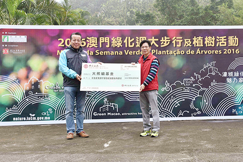 支票捐贈儀式於三月二十日上午在路環石排灣郊野公園舉行,由中國銀行(澳門分行)副行長葉兆佳捐贈予「大熊貓基金」行政管理委員會主席戴祖義接收,捐贈金額為澳門幣九十二萬四千四百二十元。