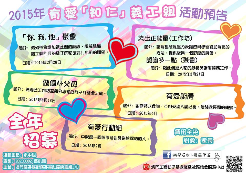 以下是2015年有愛「知仁」義工組活動預告,歡迎各位踴躍參與!熱烈歡迎您的加入!