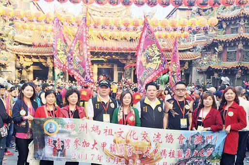 澳門神州媽祖文化交流協會會長關金花率領協會常務副會長關友仁、副會長張琳婧、副會長翁春勇、副理事長關茘英及廈門分會會長陳志雄等一行,於本月22日參加在台灣大甲媽祖鎮瀾宮舉行的「大型觀光文化節」盛會。