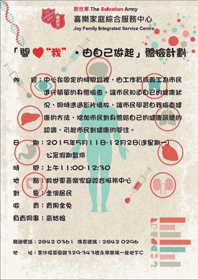 「關心我 由自己做起」如果大家想簡單知道自己既身體狀況(血壓、心跳、體重),可以逢星期一到我地中心進行簡單既身體檢查