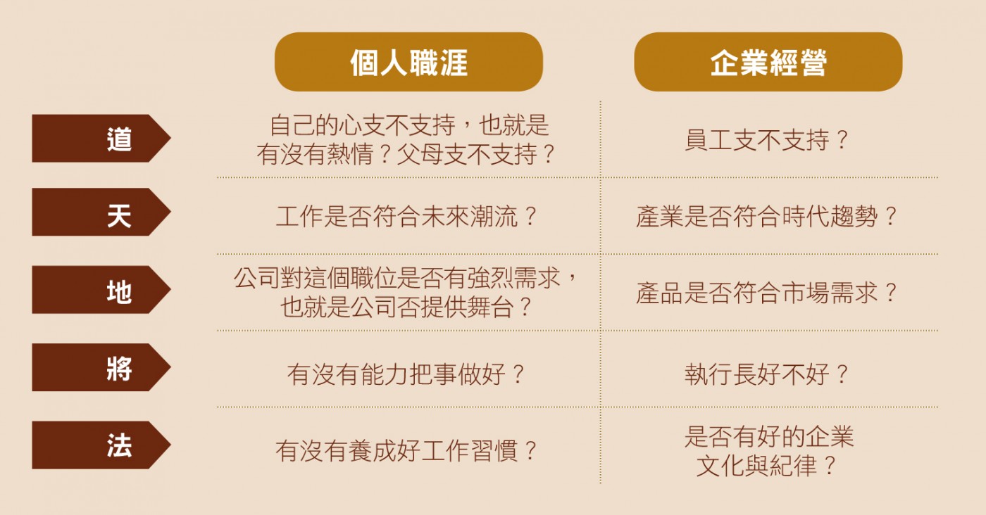 策略:「道、天、地、將、法」,五事校準企業經營方向
