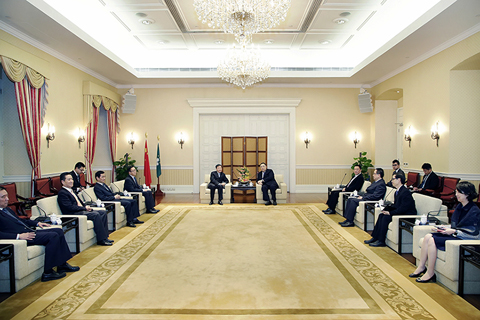 行政長官首先感謝姜增偉和中國國際貿易促進委員會關心、支持澳門的發展,他表示,澳門特區努力邁向經濟適度多元發展,其中會展業是重點加大力度推動的產業,澳門特別行政區政府與中國國際貿易促進委員會日後可加強合作關係,從長遠方向促進澳門會展業取得更大的進步。