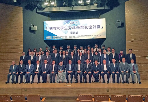 2017「澳門大學生天津學習交流計劃」昨天(6日)假澳門旅遊學院舉行開班儀式。全國政協副主席何厚鏵、全國政協港澳台僑委員會副主任華建、天津市政協主席臧獻甫、澳門中聯辦副主任陳斯喜等出席。來自本澳五所大專院校,合共30名參與交流計劃的大學生,將於本月中下旬赴天津南開大學進行15天的交流活動,包括參與專題講座及實地考察等,學習當地的文化遺產保育經驗。