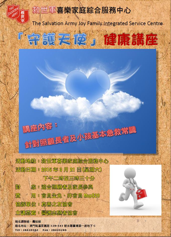 由澳門真善之友協會、救世軍喜樂家庭綜合服務中心及澳門醫護志願者協會合辦之「守護天使培訓講座」即將舉行。